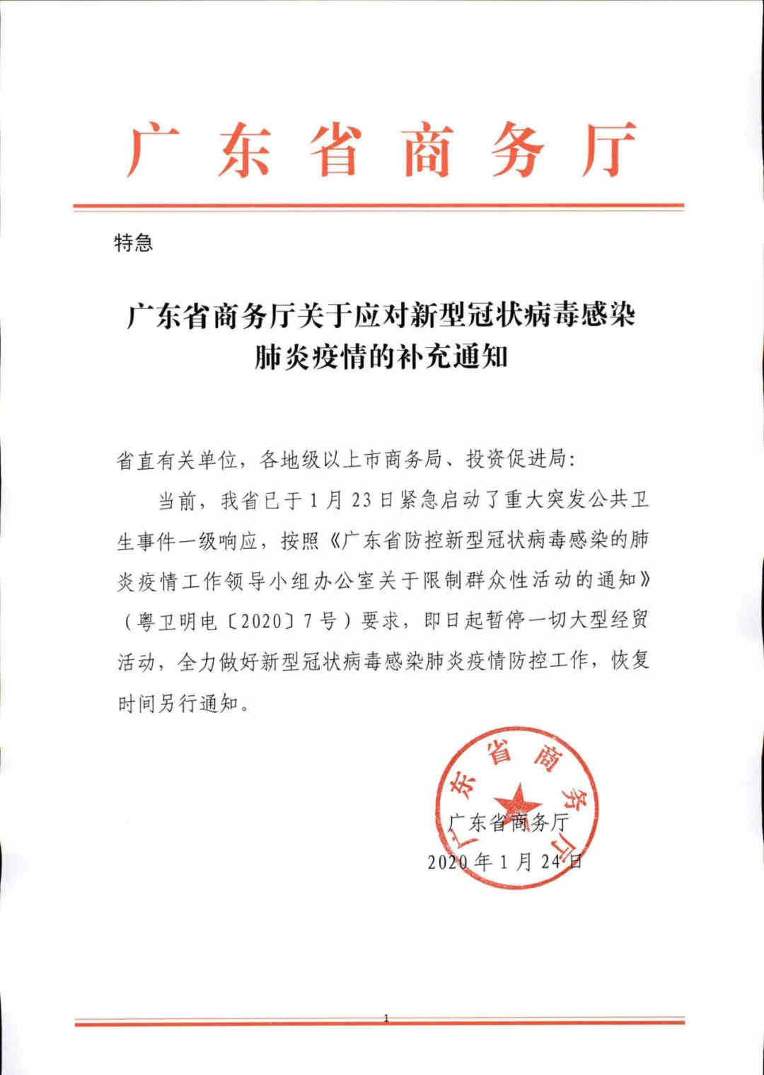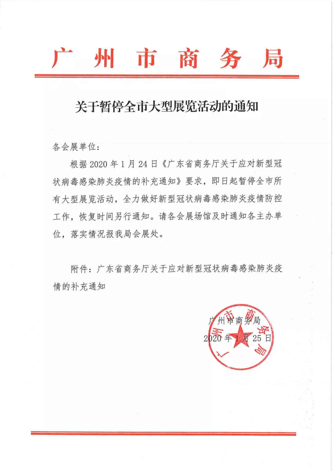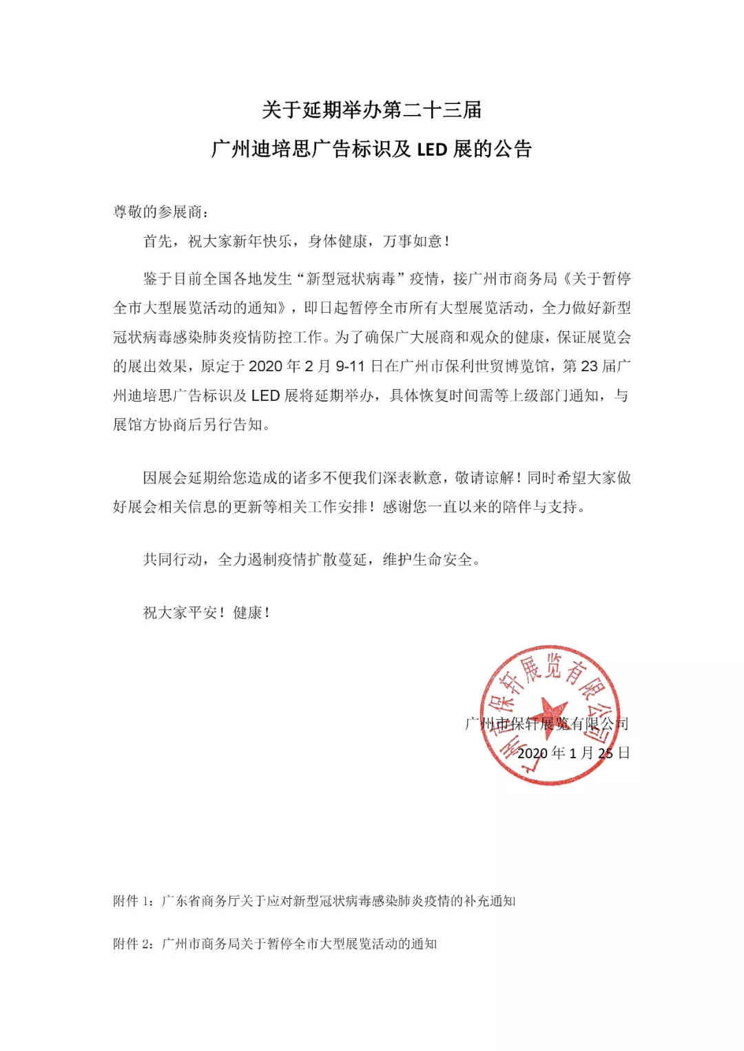 針對目前“新型冠狀病毒”的疫情防控要求,接廣州市商務局《關于暫停全市大型展覽活動的通知》,即日起暫停全市所有大型展覽活動,全力做好新型冠狀病毒感染肺炎疫情防控工作。為保障廣大展商和觀眾的健康,保證展覽會的展出效果,原定于2020年2月9-11日在廣州市保利世貿博覽館舉辦的“第23屆迪培思廣州國際廣告標識及LED展”將延期舉辦,具體恢復時間將根據形勢發展第一時間另行通知。