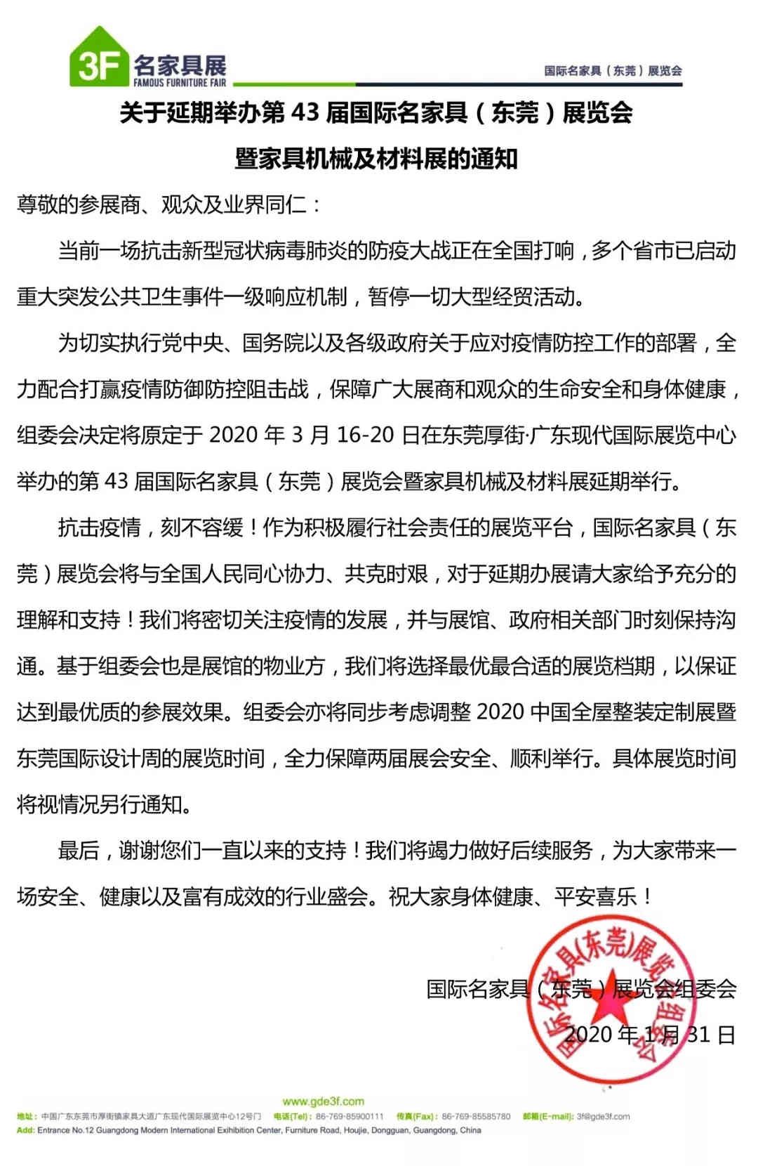 重要通告 | 第43屆國際名家具(東莞)展覽會暨家具機械及材料展將延期舉行