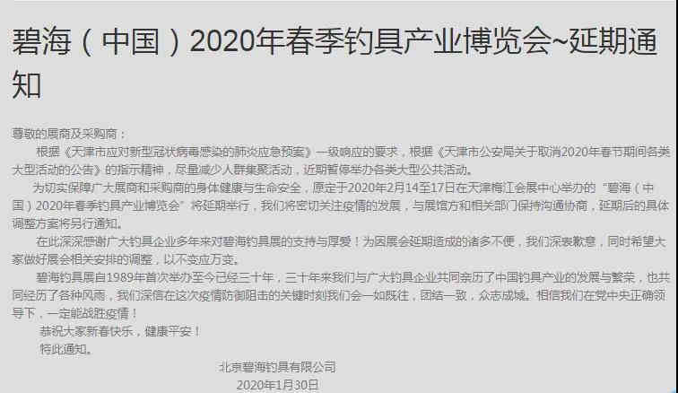 原定于2月14-17日于天津梅江展覽中心舉辦的碧海(中國)2020年春季釣具產(chǎn)業(yè)博覽會宣布延期,具體開展時間待定。
