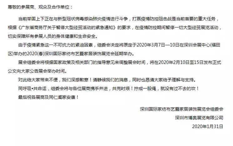 2020(春)深圳國際家紡布藝暨家居裝飾展覽會原計劃于3月7-10日在深圳會展中心舉辦,現(xiàn)已發(fā)布延遲通知,并將在2月10-15日發(fā)布公文公告具體舉辦時間。
