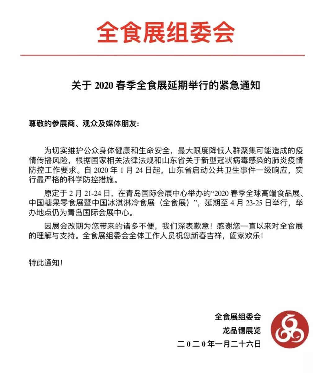2020春季全球高端食品展、中國糖果零食展暨中國冰淇淋冷食展(簡稱2020年春季全食展),將原定舉辦時間2月21-24日,延期至4月23-25日,舉辦地點(diǎn)仍為青島國際會展中心。